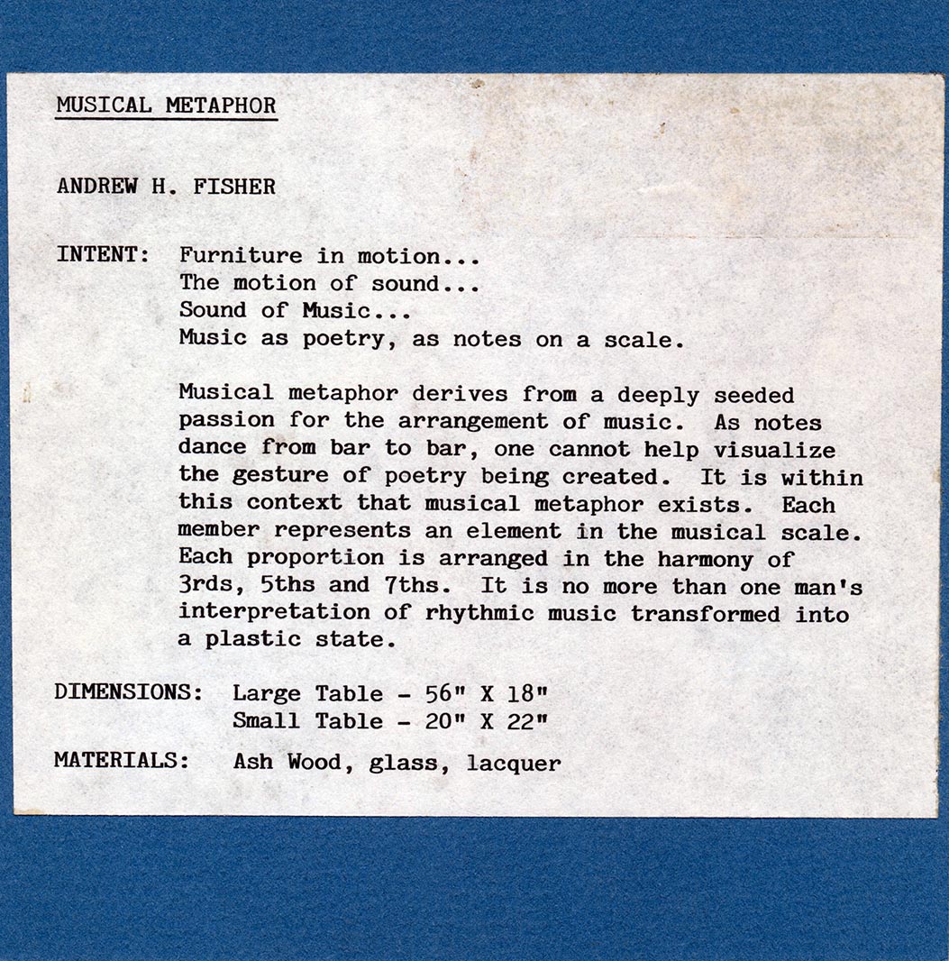 Acceptance into the Academy was no slam dunk, even if McCoy was in favor of your application. He was just one voice. Acceptance was roughly 1/40, and certainly a long shot for someone with a designer/craftsman portfolio. Most of the students who applied had gone to prestigious undergraduate schools and pursued a pure design path. So I knew I needed to be at the top of my game. I bought a nice leather portfolio. I sweated over my work. I remember spending 12 hours photographing two tables to create the perfect image. Then I waited. And hoped.