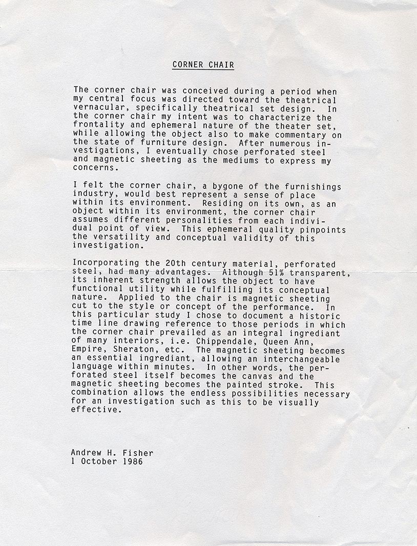 It helped that I had been a teacher the previous four years because there were no classes. Just a studio. They give you a desk and then it’s, “We’ll see you Friday.” Critique Day. The day when you present your work, justify it, cite your sources, try to gain support for your progression, your idea, your direction. It was intense. And over time it became frustrating. I came from a maker’s world and many of my old friends were already making things. They had left school behind.